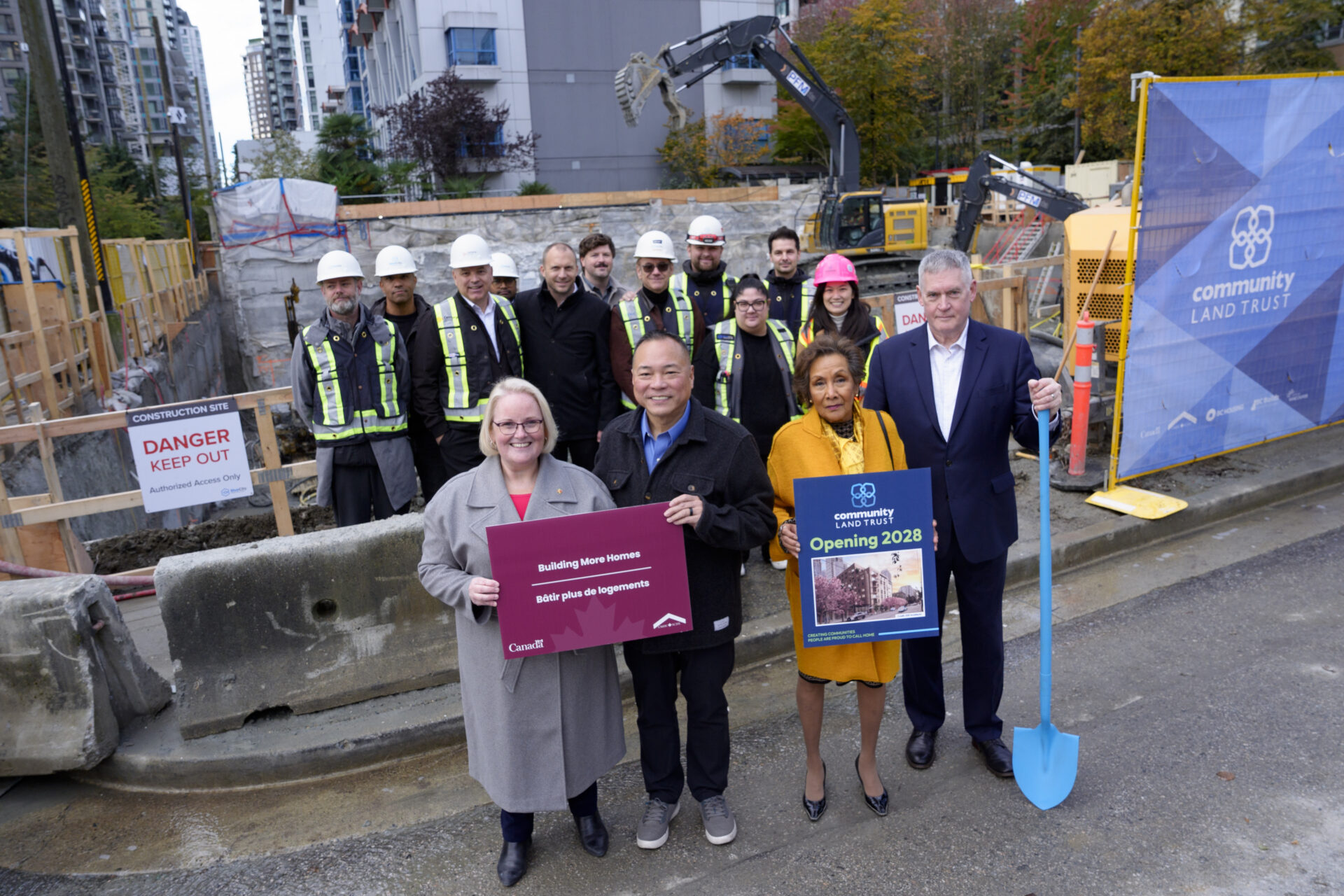 Community Land Trust and BlueCity Construction staff were joined by Jill McKnight, Minister of Veterans Affairs and Associate Minister of Defense and, Member of Parliament for Delta, Terry Yung, Member of the Legislative Assembly for Vancouver-Yaletown, and the Dr. Hedy Fry, Member of Parliament for Vancouver Centre to announce $69 million in funding to support the development of 112 affordable co-op homes.